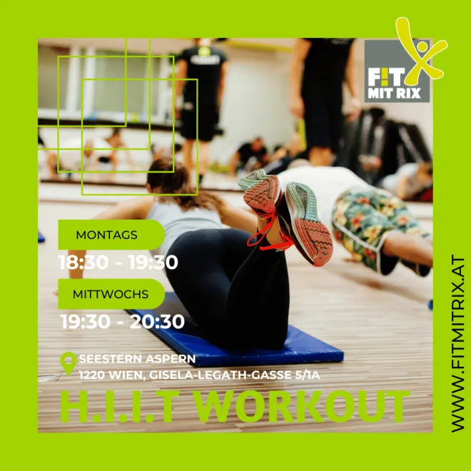 FIT mit RIX - Gerhard EderBei dem hochintensiven Intervalltraining erwartet Dich jede Menge Spaß, hohe Energie und herausfordernde Workouts. Durch das HIIT wirst du zeitsparend fit, kurbelst deinen Kreislauf sowie Stoffwechsel an und steigerst deine Kondition. Außerdem macht das Training in der Gruppe Spaß und ist motivierend. Je nach deinem Ziel kannst du dabei abnehmen, schneller, ausdauernder und kräftiger werden. Was brauchst du für das H.I.I.T? Das Hochintensive Intervalltraining bei Fit mit Rix ist ein Bodyweight-Training. Du brauchst also nur Sportgewand, Sportschuhe, ein Handtuch und ein Getränk. Für die einzelnen Übungen brauchst du keine Vorkenntnisse. Diese sind von jedem schaffbar, werden vom Trainer erklärt und bei Bedarf vorgezeigt. Bitte komme 10 Minuten vor Beginn, damit du in Ruhe dich umziehen kannst. Ich freue mich auf Euch. Sportliche Grüße Gerhard Anfahrt & Erreichbarkeit: U-Bahn: U2 Seestadt Buslinie 84A: Hanna-Arendt-Platz Buslinie 88A und 88 B: Seestadt U2 Parken: wenige Parkplätze; öffentliche Kurzparkzone Parkpickerlpflicht bis 22 Uhr